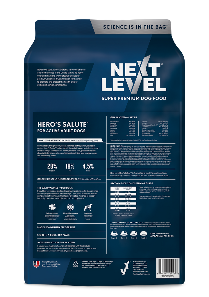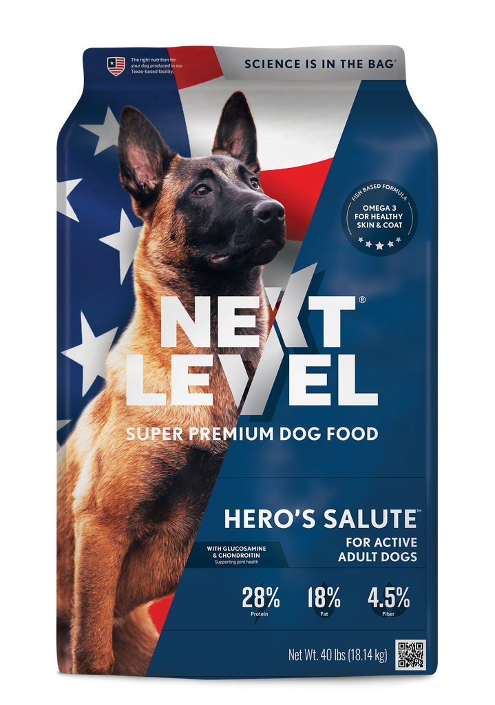 Next Level salutes the veterans, service members and their families of the United States. To honor your commitment, we’ve created this super premium, science-driven nutrition formulated to promote and protect the health of your dedicated canine companions.